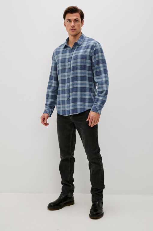 A best-selling shirt, the Lennox, is made with a luxe melange yarn, brushed on both sides for extra softness and lasting comfort, featuring a single chest pocket and metal buttons to create a novel look.