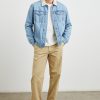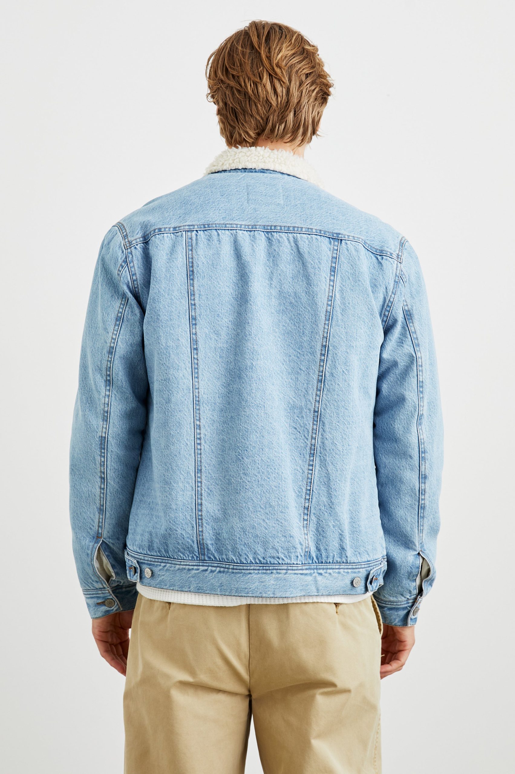 Long sleeve, rugged denim canvas exterior in a light blue, cream collared jacket featuring faux sherpa lining, chest patch pockets with button closures, button-down front closure, and classic fit. This plush, vintage inspired jacket is the perfect layering piece for cooler transitional weather.