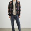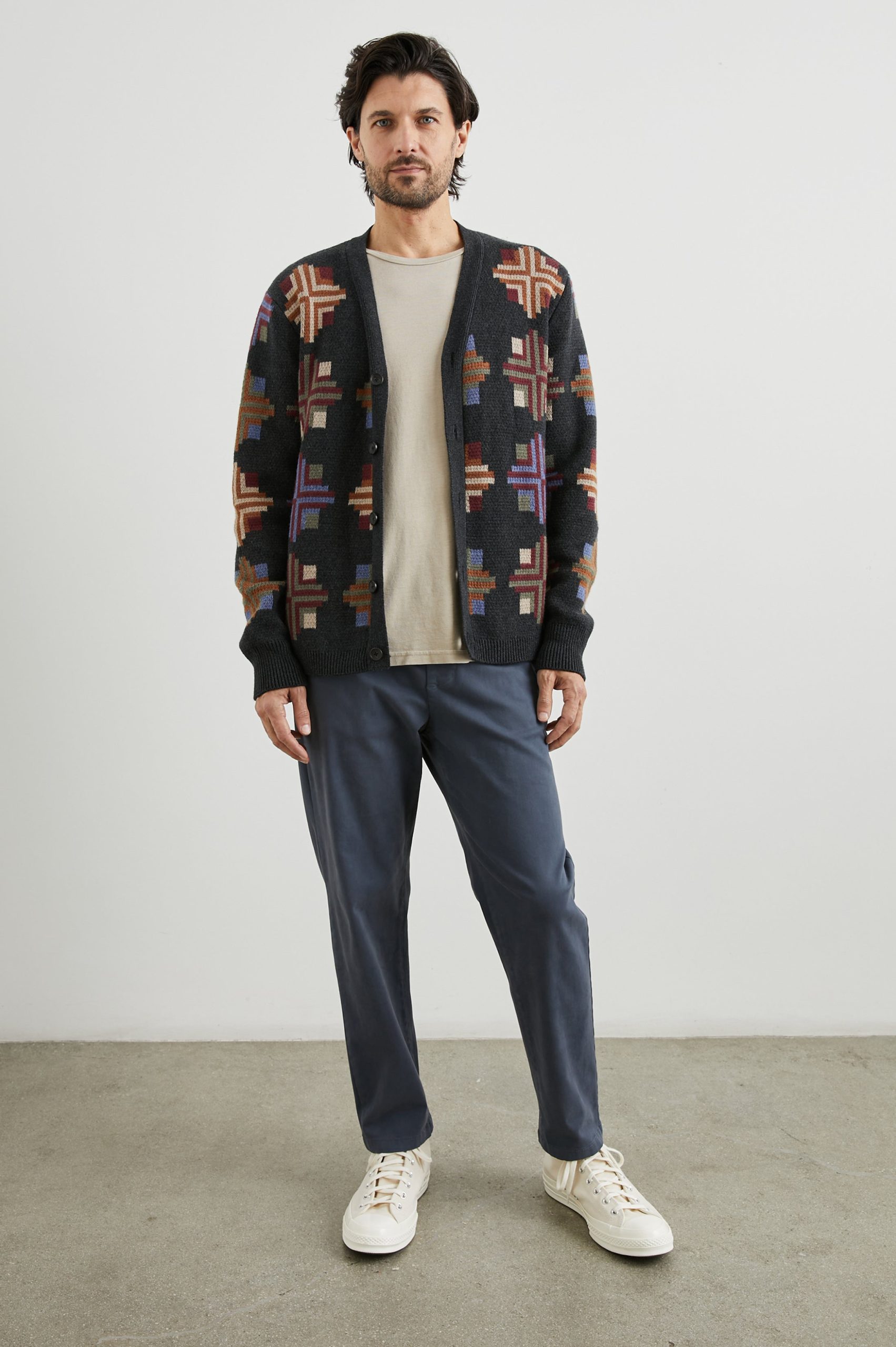 Introducing the heritage-inspired Taos, a bold, v-neck cardigan sweater crafted from heavy cotton wool. Featuring a jacquard patchwork pattern reminiscent of heritage quilts, the Taos sweater ensures a standout look.