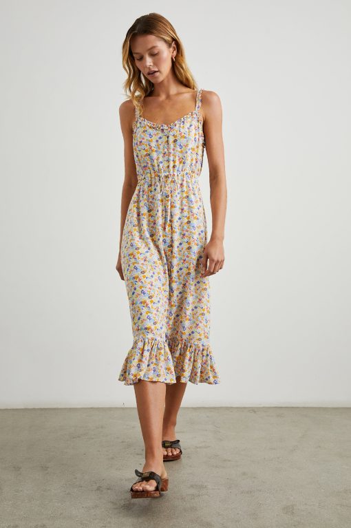 A floral midi for the season, the Adalyn features subtle ruching around the neckline with a frill hem and drawstring waist. Wear under your Rails denim jacket for an effortless look.