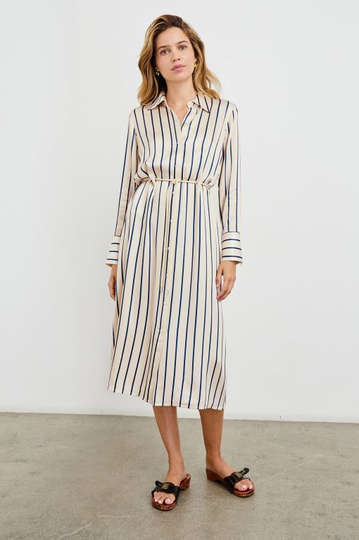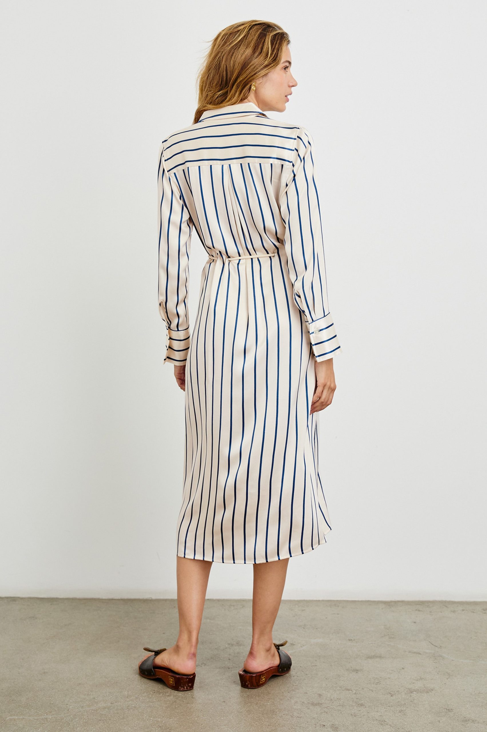 Designed for versatility, the Anina is a midi-length shirt dress that transcends seasons. It is ultra-soft with a luxe, satin crepe fabrication, and features full-length buttons, shirting details as well as a built-in belt that can be tied at the front or back.