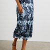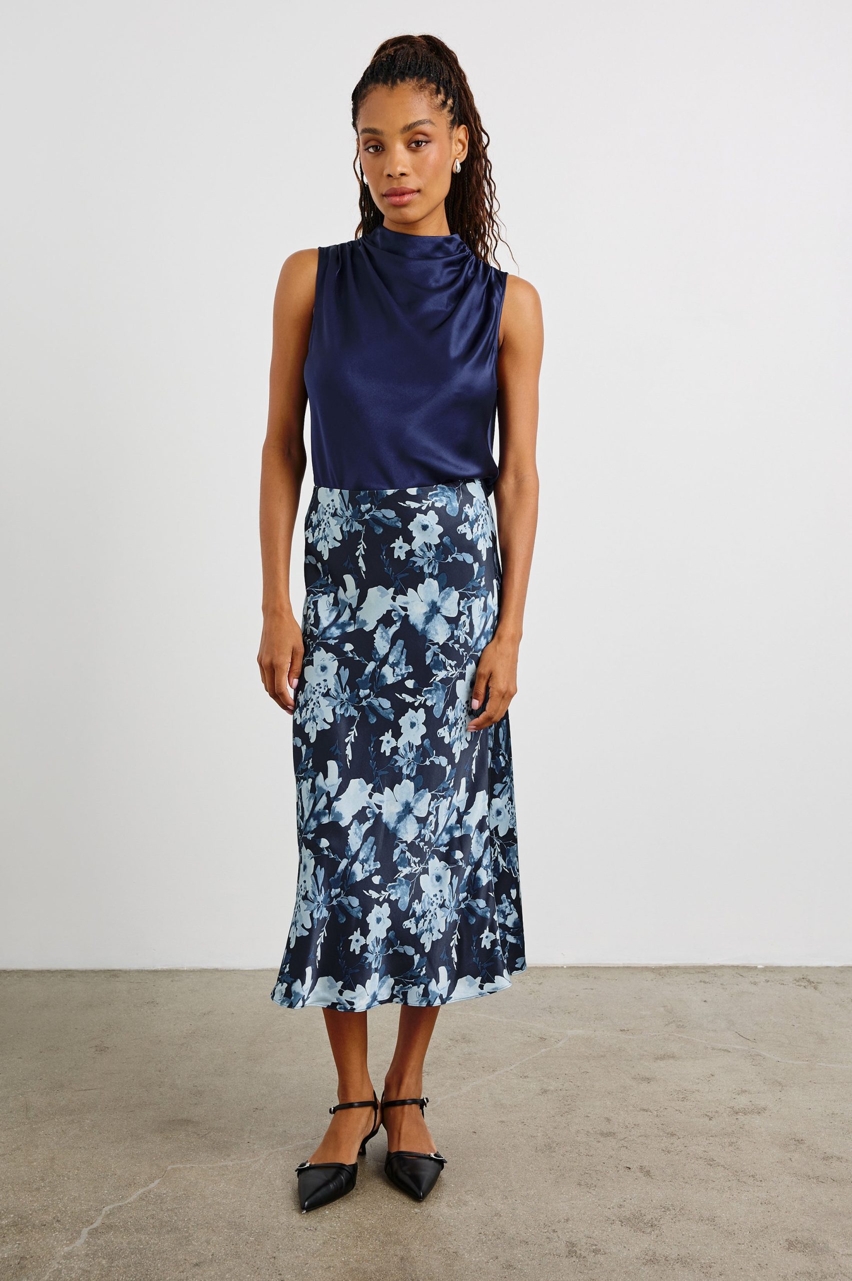 This high-waisted pullover style midi-length skirt features a concealed elastic waistband. Pair with a t-shirt or over-sized sweater for an easy day time look, then just add heels for an effortless transition to night.