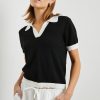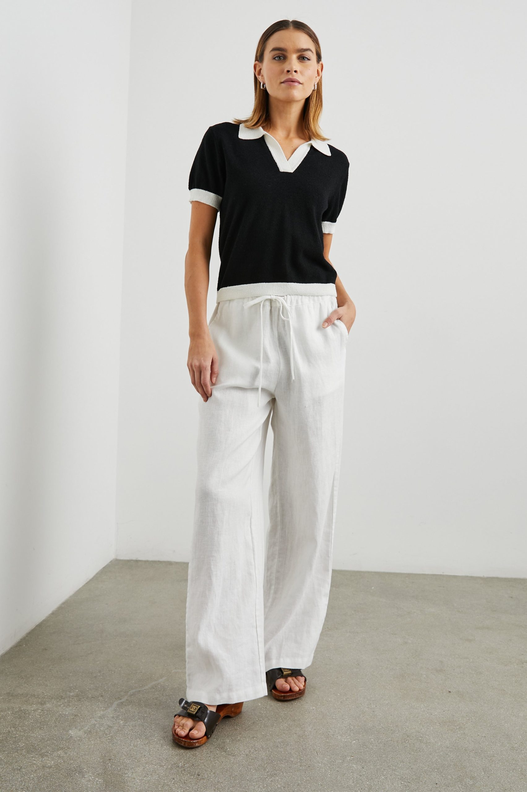 The Arya is a cotton blend with a black body and contrasting white block edging. Pair this top with a midi-skirt or pull-over the Rue dress for an instant outfit.