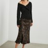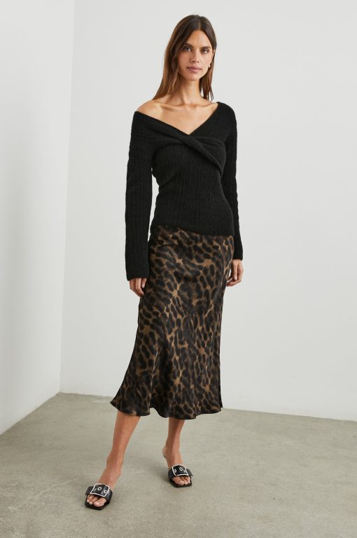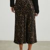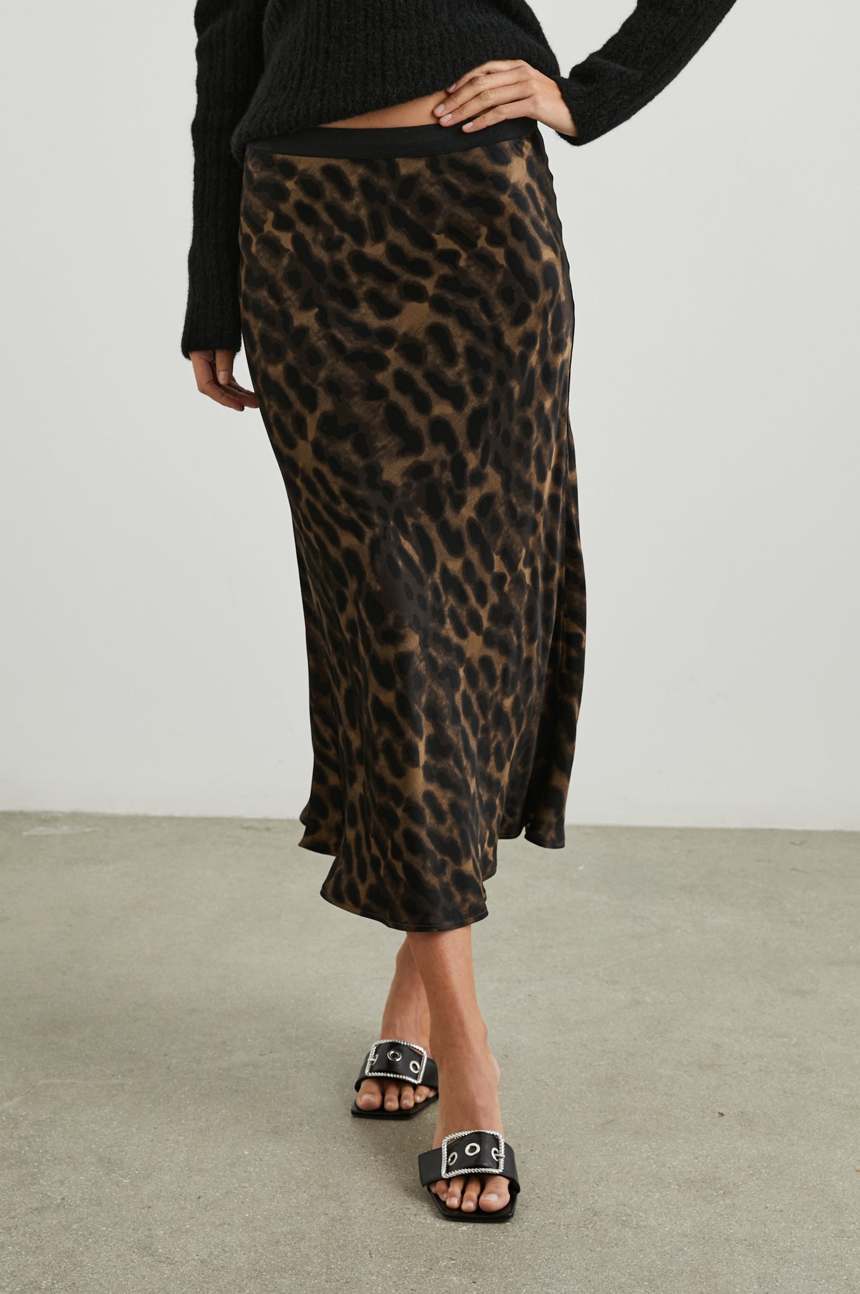 Super smooth, satin crepe, high-rise, unlined, sleek leopard print midi skirt featuring black exposed elastic waistband, swingy fit, and flattering bias cut. Made with luxurious fabric in an easy pullover silhouette, this swingy skirt is perfect for work or play.