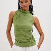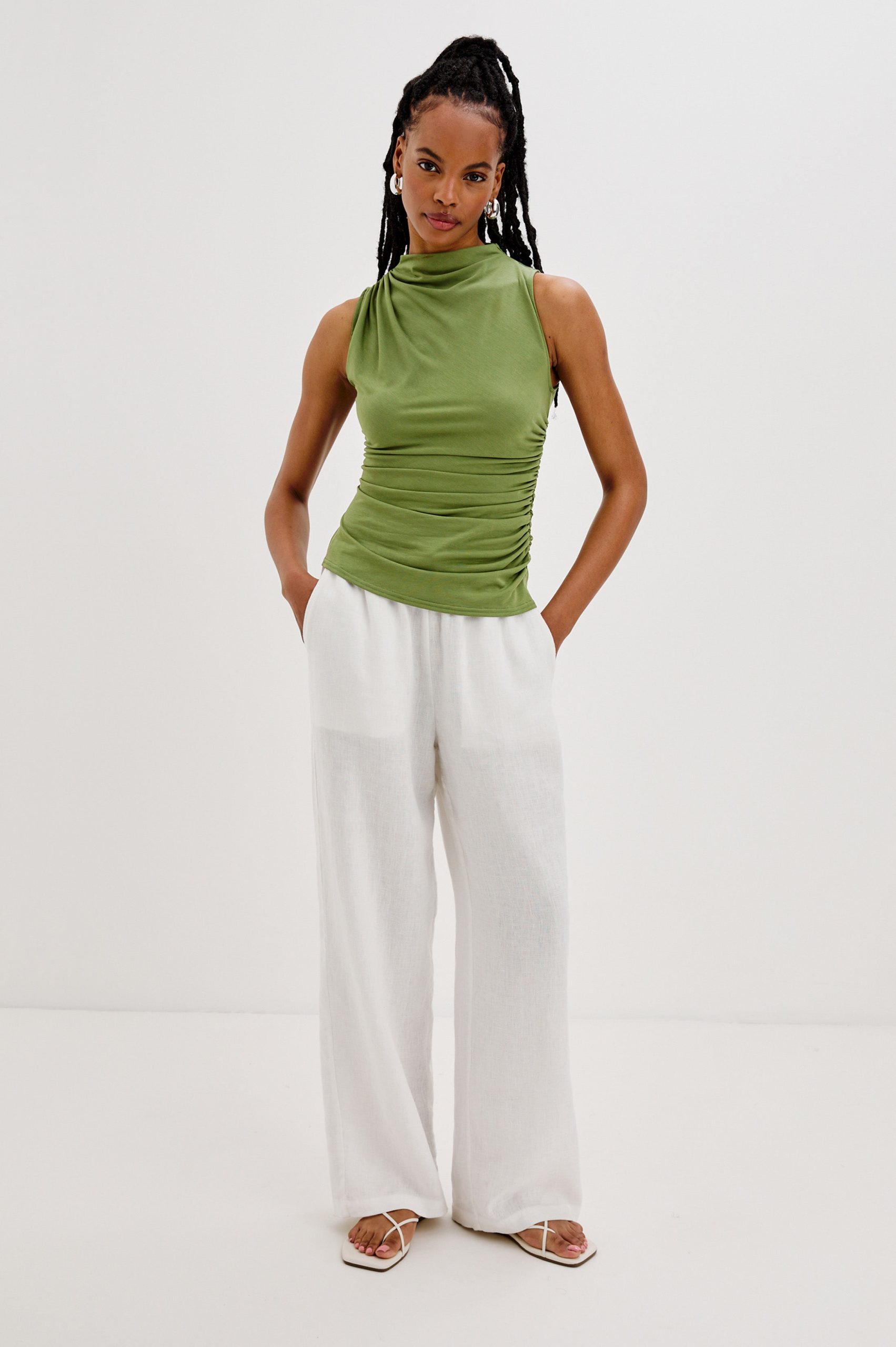 Cut from a supple brushed tissue with a mock neck, slight stretch, and light ruching at the seams, the Christen fits and flatters any figure seamlessly.