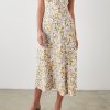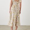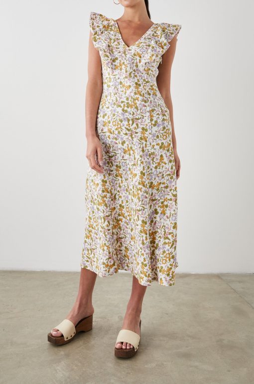Perfect for any occasion, this dress features delicate micro sleeves that gracefully flow down to the waist, criss-cross ties in the back, and stunning floral print on heavyweight linen material, this dress is the epitome of bohemian chic.