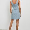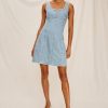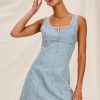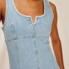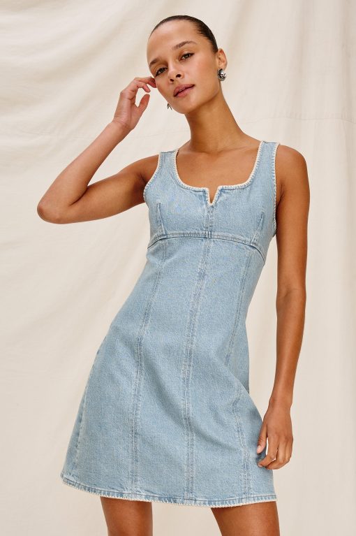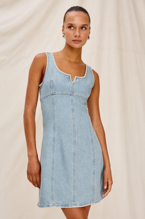 The Cove is a denim mini dress featuring a fitted bust and A-line silhouette for a flattering fit. Blanket-stitched details at the neck and hemline add the perfect finishing touch.