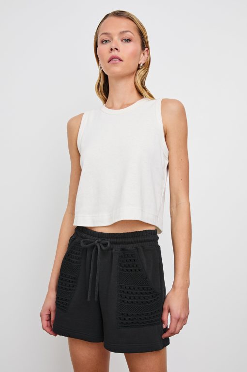 The Eddie is a versatile lounge short crafted from soft cotton terry with crochet accents and an elastic drawstring waist. Designed with a high-rise fit and light stretch for everyday comfort.