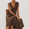 The Eleni midi dress stuns in satin crepe, with cap sleeves, elegant shirring details, and an asymmetrical skirt.
