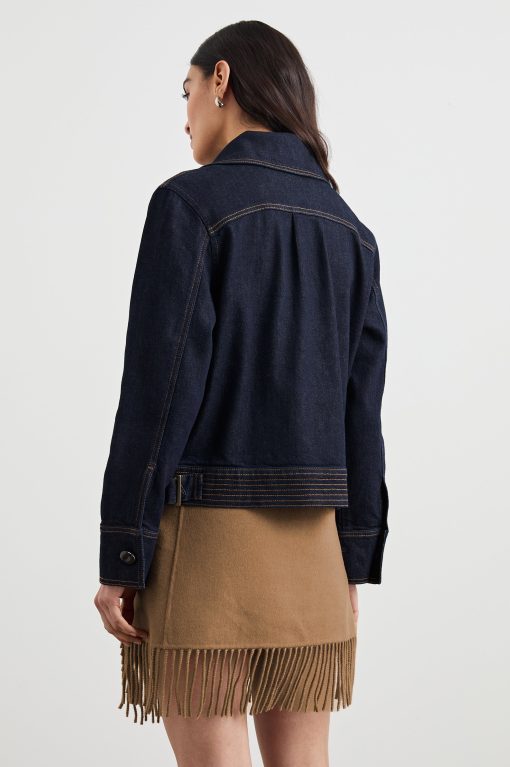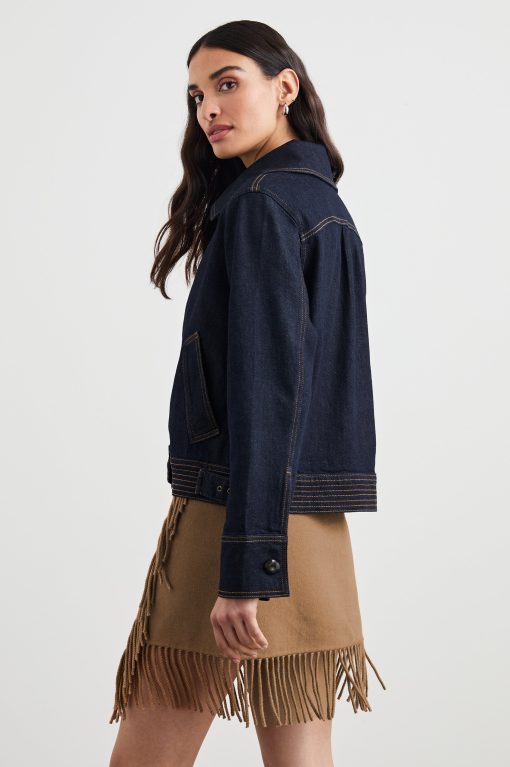 The classic denim jacket just got a modern makeover. Making a statement all on its own, the Figueroa Jacket features a Peter Pan collar, adjustable buckle tabs, and contrast stitching. Pair with denim or your favorite skirt for an instant outfit.