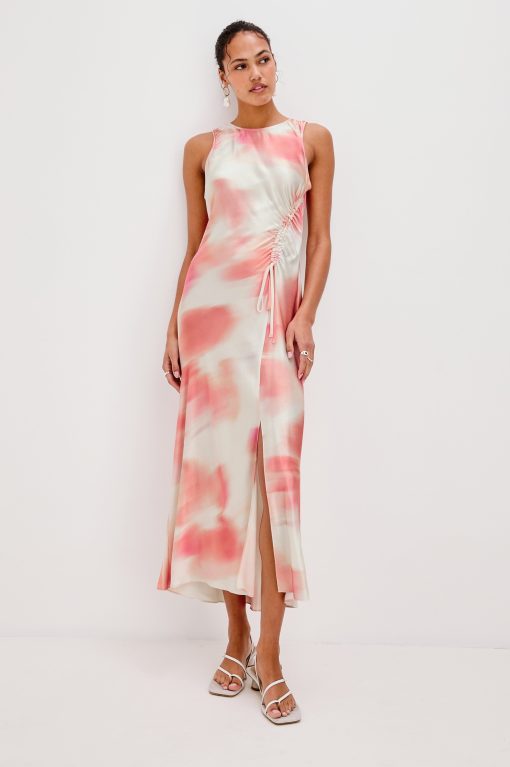 The Gabriella is a slip dress, but better—crafted from a textured satin that skims the silhouette without clinging and falls at a midi length. Flattering finishing touches include a side slit and ruched drawstring.