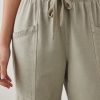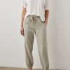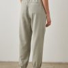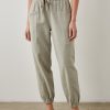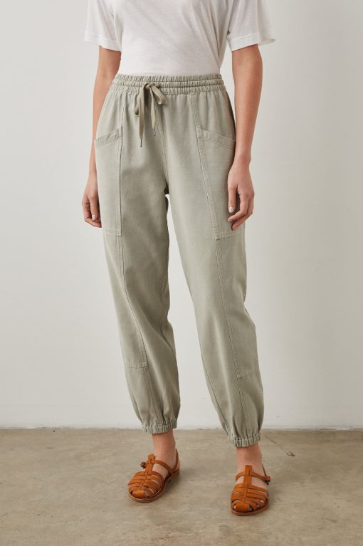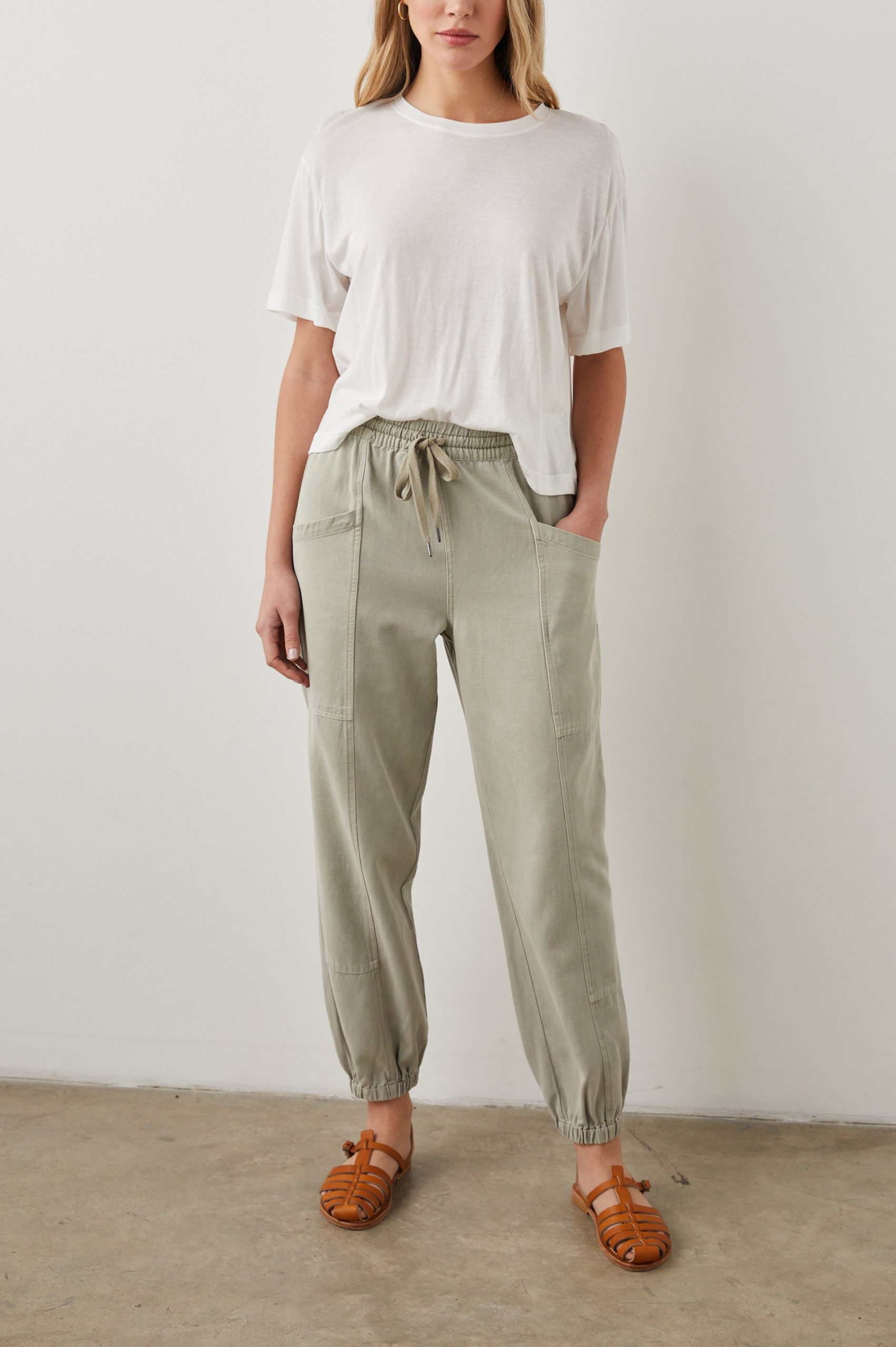 The Haven Pant is an easy jogger in sage green with a washed, vintage look, oversized side pockets, and front seams. Up top is a drawstring elastic waist, and below, the pant ends in a tapered cuff. A cotton twill fabrication means it's so incredibly soft.