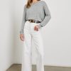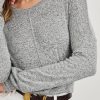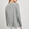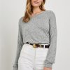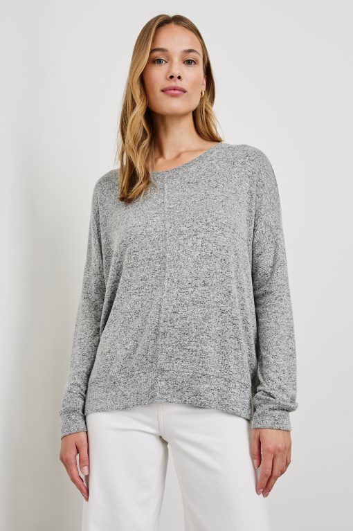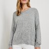 Super soft, lightweight lounge jersey, long sleeve, melange grey scoop neck knit top featuring relaxed fit, center front and back seam detail, dropped shoulder, slimming sleeves, and side slits at hem. This flattering pullover style is perfect for relaxing at home or going about your day in the most comfortable fashion.