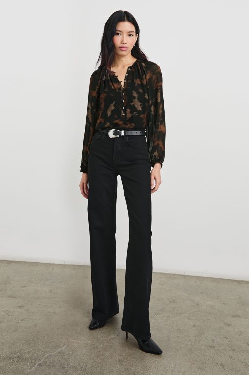 Polish any outfit with the Indi, a top that pairs perfectly with any season. Crafted from a luxe chiffon, the collarless Indi boasts subtly voluminous sleeves and natural shell buttons. Wear for a night out or throw it on for daily errands — it redefines the everyday blouse.