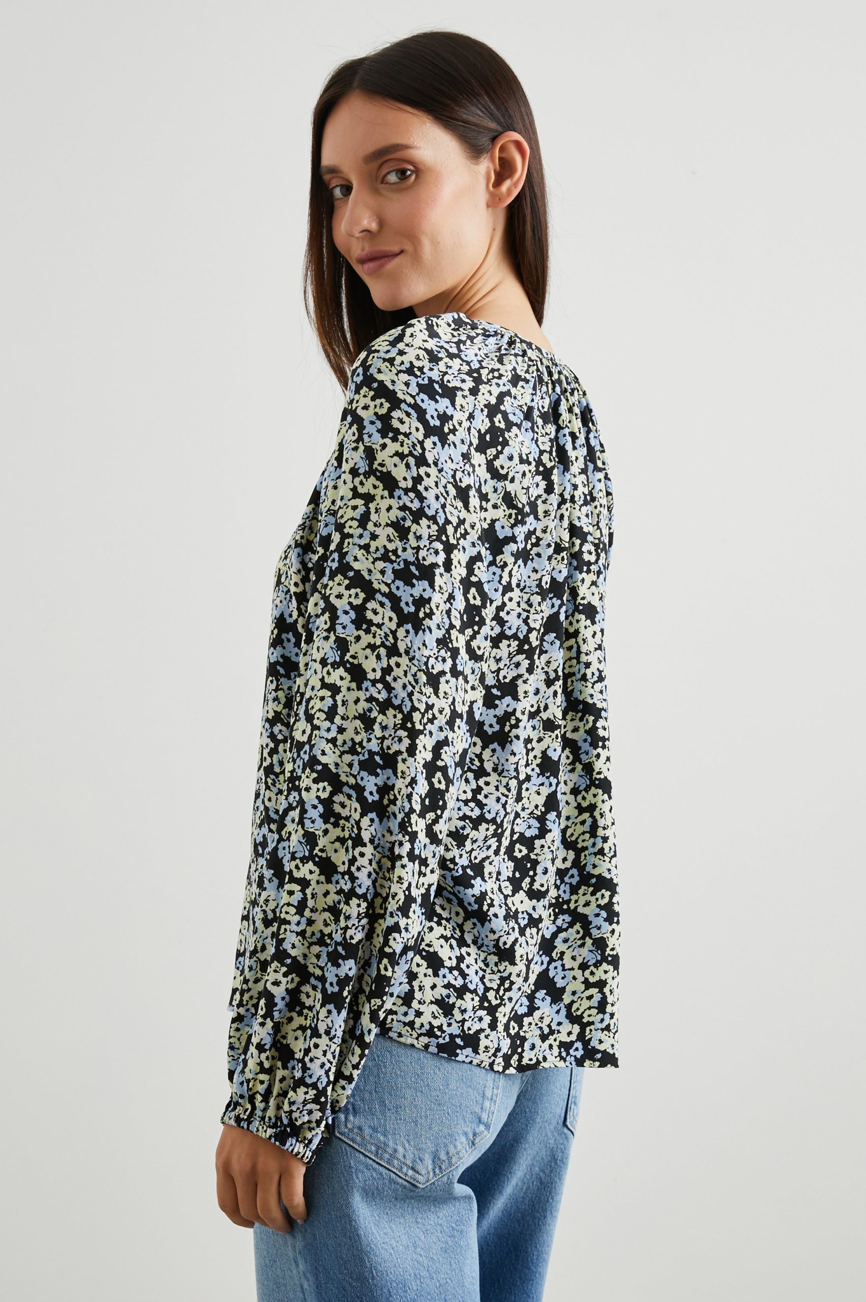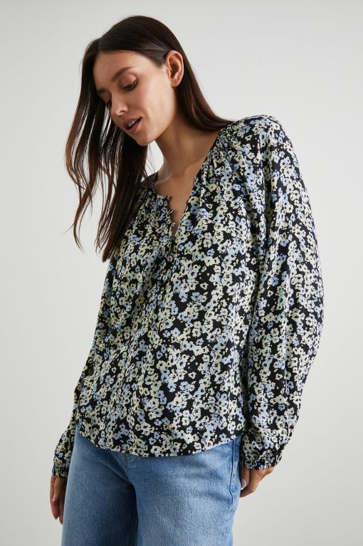The Indi Top makes any outfit pairing look polished, whether it be denim, a midi skirt, or trousers. It’s a collarless blouse with voluminous sleeves, natural shell buttons, and a beautiful, 70s-inspired floral print.