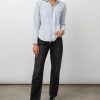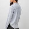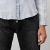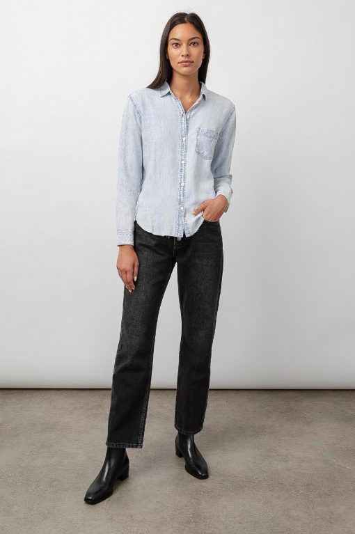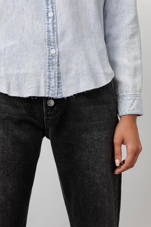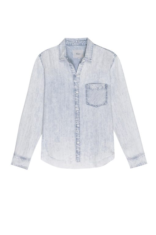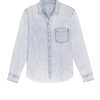 Lightweight, Tencel™ denim, long sleeve, faded light blue collared buttondown shirt featuring acid wash finish, classic fit, patch pocket at chest, and raw hem. A super soft and lightweight take on the classic denim shirt featuring custom dyed details for a one-of-a-kind look.