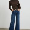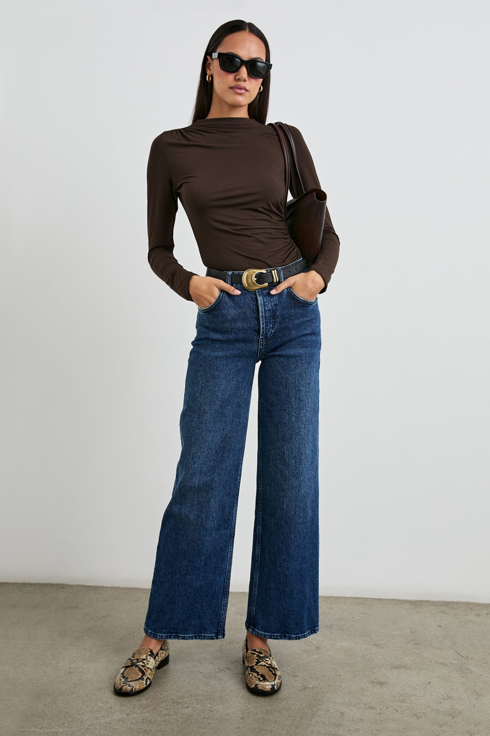 The Joelle top is a modern take on the classic long sleeve. Made from soft gauge jersey, this style features an asymmetrical mock neck with shirring details from the right shoulder.