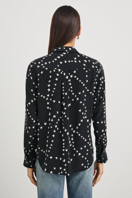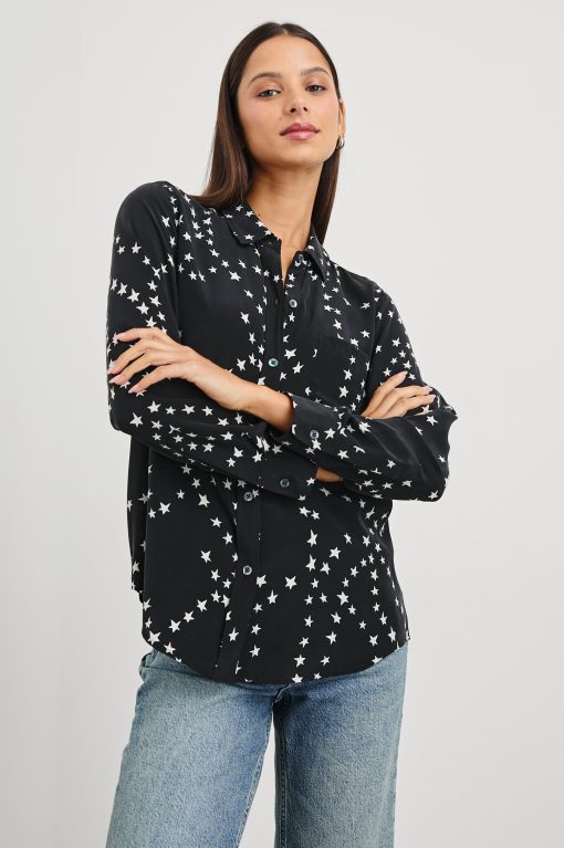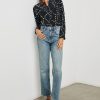 This classic design features a playful, stylish chain print mixed with a luxe, elevated fabrication to create a timelessly polished look. Made from washed silk, this button-down tailored top features a single front pocket.