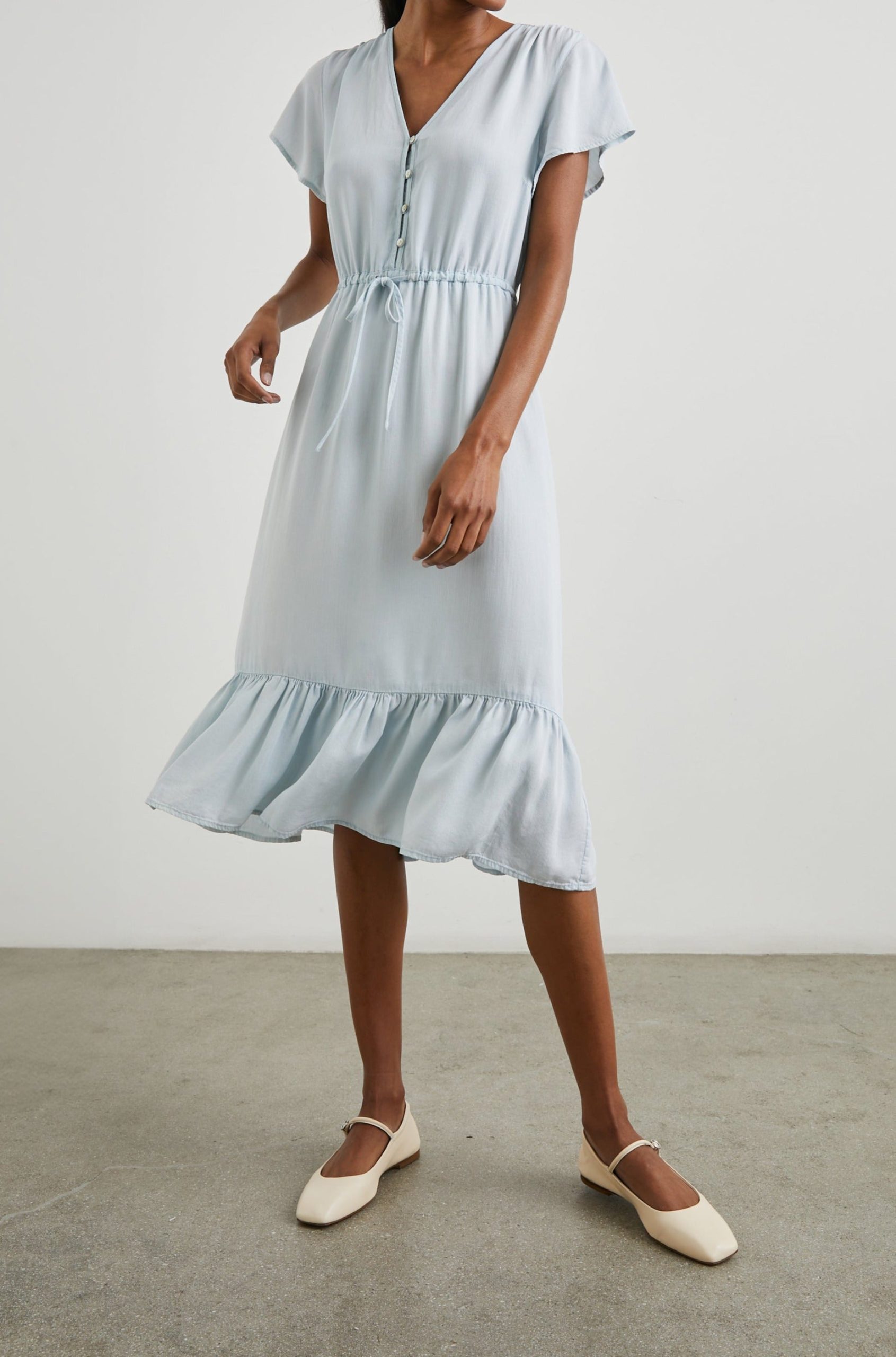 The Kiki Dress comes in a light vintage denim hue. The midi dress has a v-neckline, drawstring waist, and ruffles at the hem. Plus, it’s crafted in our best-selling Tencel denim fabric that’s super soft and lightweight. Great for work or weekend, it looks pretty and polished no matter where you wear it.