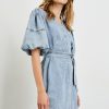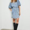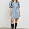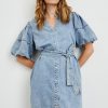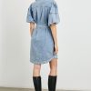 This mini dress features pleated puff sleeves with a flattering curved hem, and is finished with a self-tie belt for an adjustable fit. Crafted from soft, supple denim and finished with center front snaps.