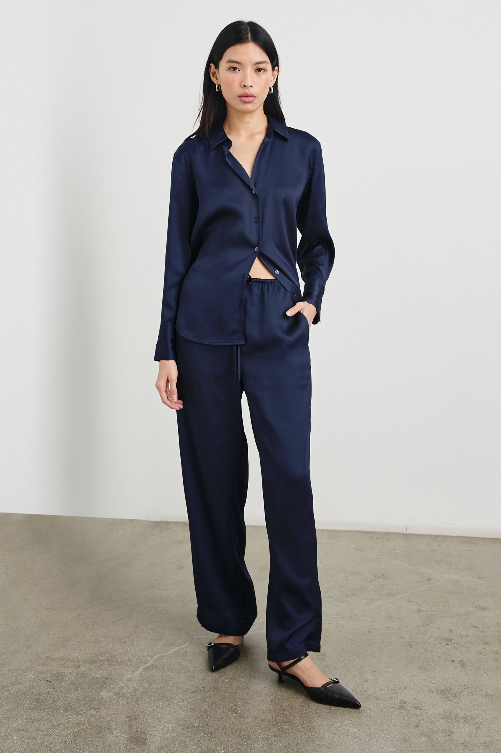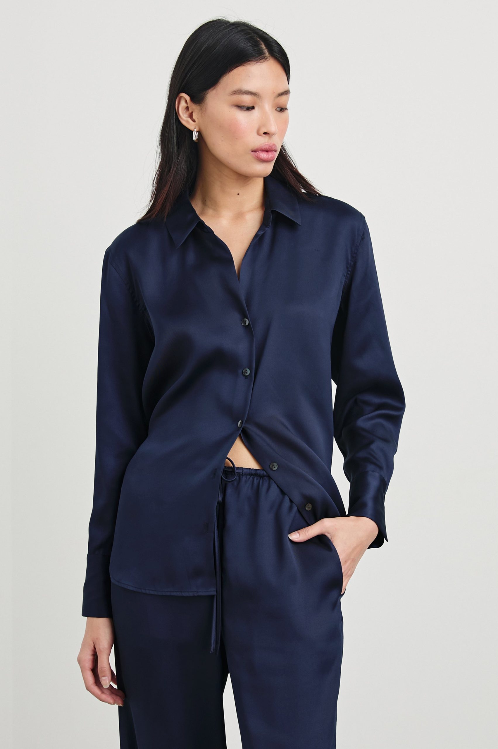 Crafted in shiny twill, this soft and sleek button-down features a relaxed body for everyday wear. Tuck in, layer over a tank, or pair with the Damani Pant for an instant outfit.