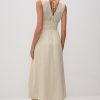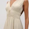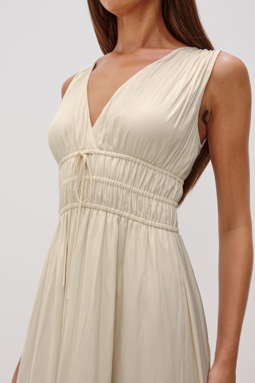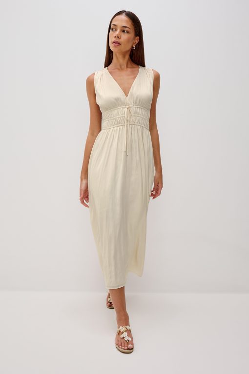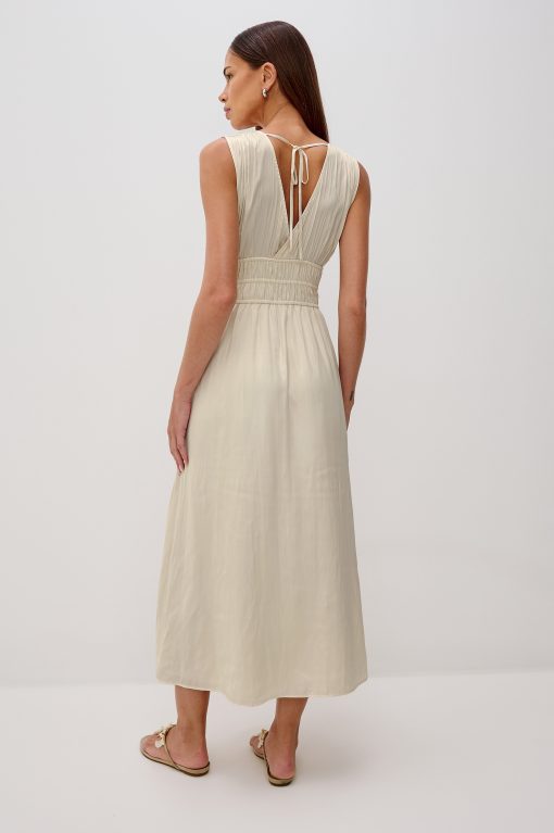 A midi dress with a plunge neckline crafted from a supple rayon crepe. With smocking, wide straps and an adjustable back strap, the Lilith has a flowing silhouette that cinches at the waist.