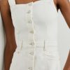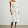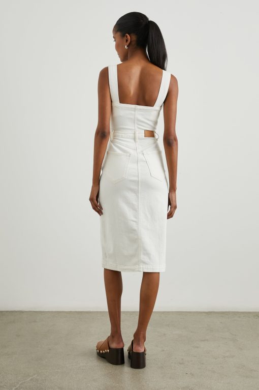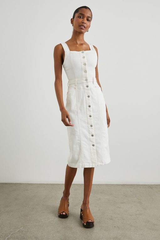 A retro moment. The Malibu Dress is a midi dress with a full button front, retro style lines, and adjustable straps. Vintage Ecru is our classic ecru wash with comfort stretch and a soft hand feel.