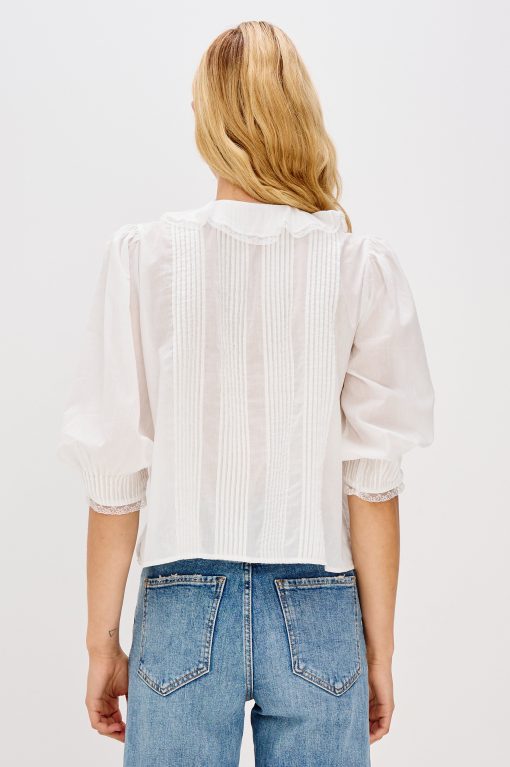 The Mare is a classic blouse with cascading ruffle detailing down the front. Designed in soft beach cotton with a relaxed fit, it’s finished with delicate lace trim at the neckline and cuffs for a feminine touch.