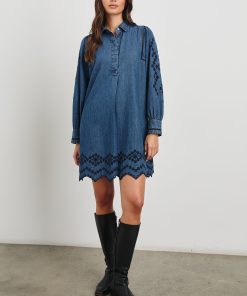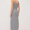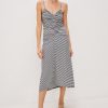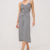 The Mari is a midi dress with notable details including a fitted bodice, a-line skirt, and ruching details down the center. Fully lined with adjustable straps.