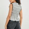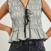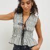 The Martine is a structured peplum tank crafted from heavy cotton poplin. Front ties serve as adjustable closures for the plunging neckline, while delicate ruffle details complete the look.