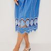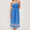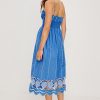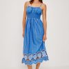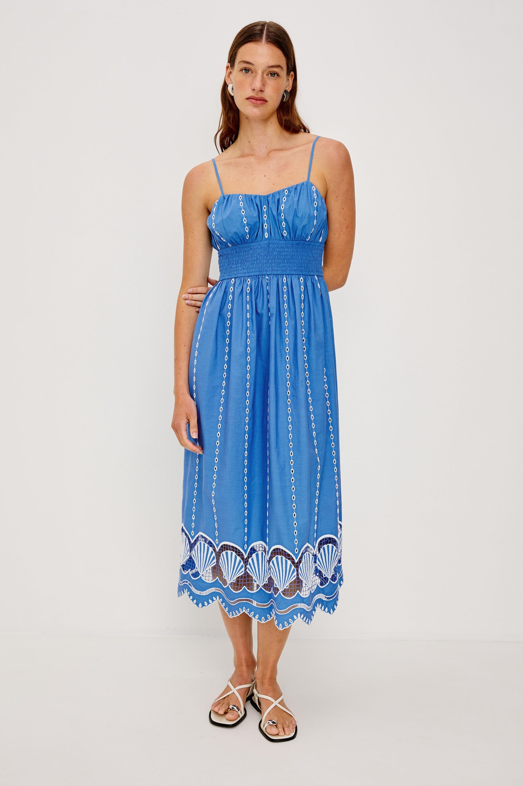 The Murano is a dreamy maxi dress in cotton poplin, featuring an A-line fit with elastic shirring at the waist. Coastal cues include shell embroidery and a scalloped hem.