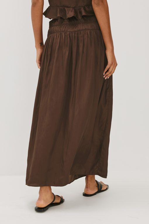 The Nara midi skirt is featured in elegant crinkle satin. A fitted waistband gives way to a flowy fit throughout, complete with a discreet side zipper for effortless wear.