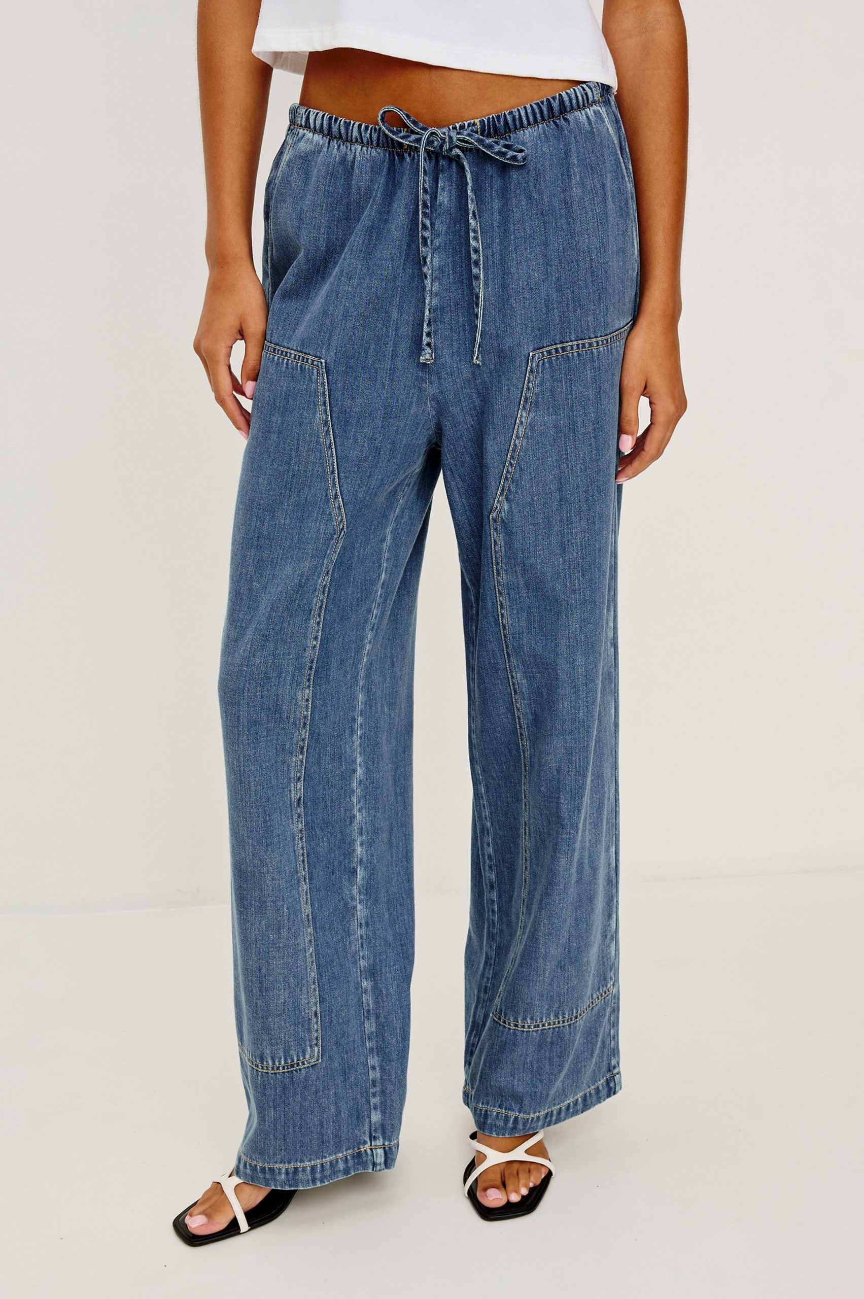 The Sanderson is a mid-rise, relaxed fit denim pant crafted from lightweight, supple cotton. Featuring carpenter panels for a laid-back look and an adjustable corded drawstring for a customized fit.