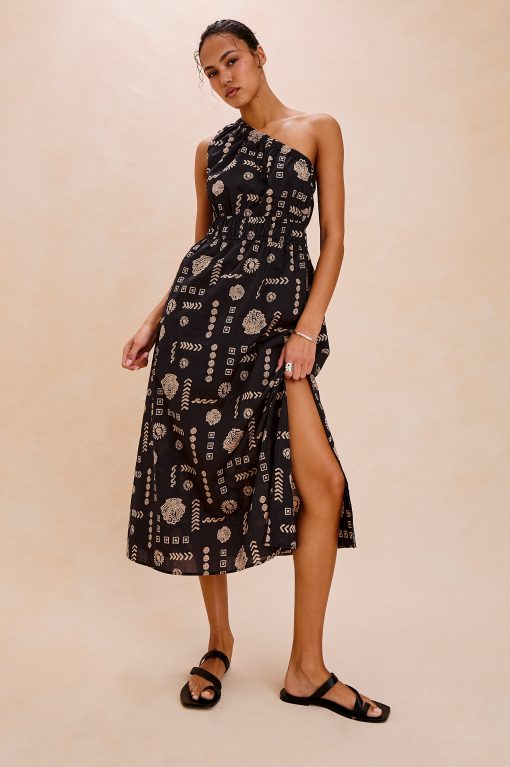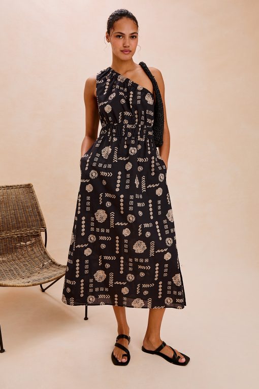 Crafted from lightweight beach cotton, the midi-length Selani offers elevated comfort with a shirred waistband and asymmetrical neckline. It’s finished with concealed pockets on the seams and a side slit for ease.