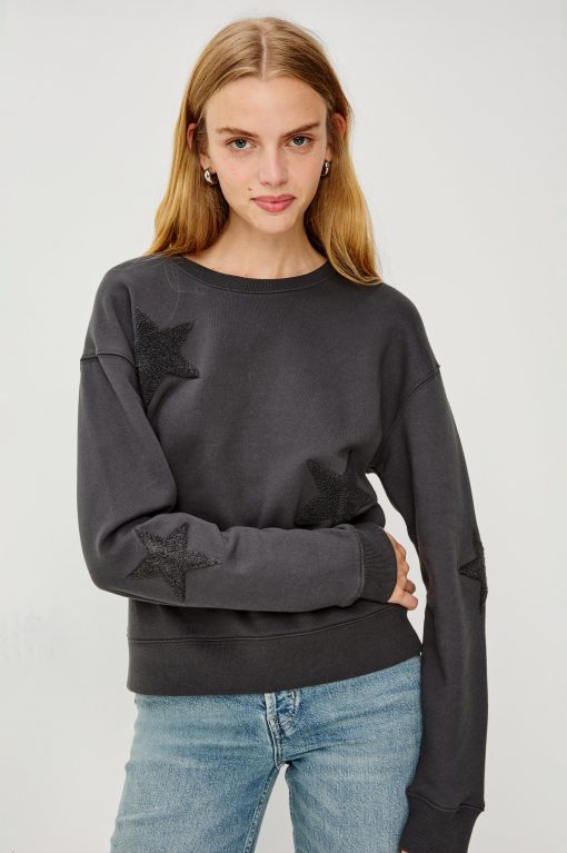 Crafted from a traditional cotton fleece with a wide crew collar and charcoal patch stars, the Sonia is synonymous with cozy cool. Throw on over a dress or keep it casual with jeans or sweatpants.