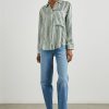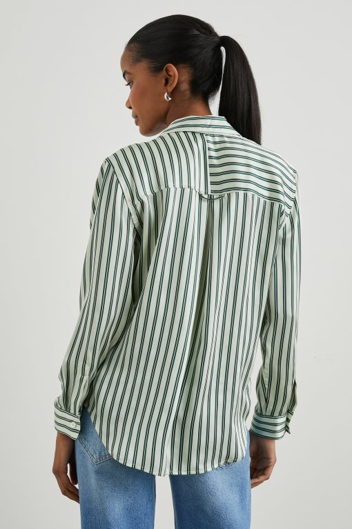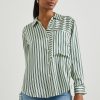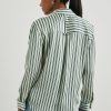 Look effortlessly refined and stylish in this unique buttondown shirt featuring luxe fabric for a polished finish. Made from super smooth silk charmeuse this green collared buttondown shirt features vertical stripes, relaxed fit, oversized patch pocket at chest, and longer length.