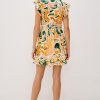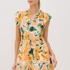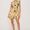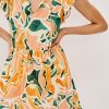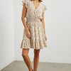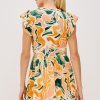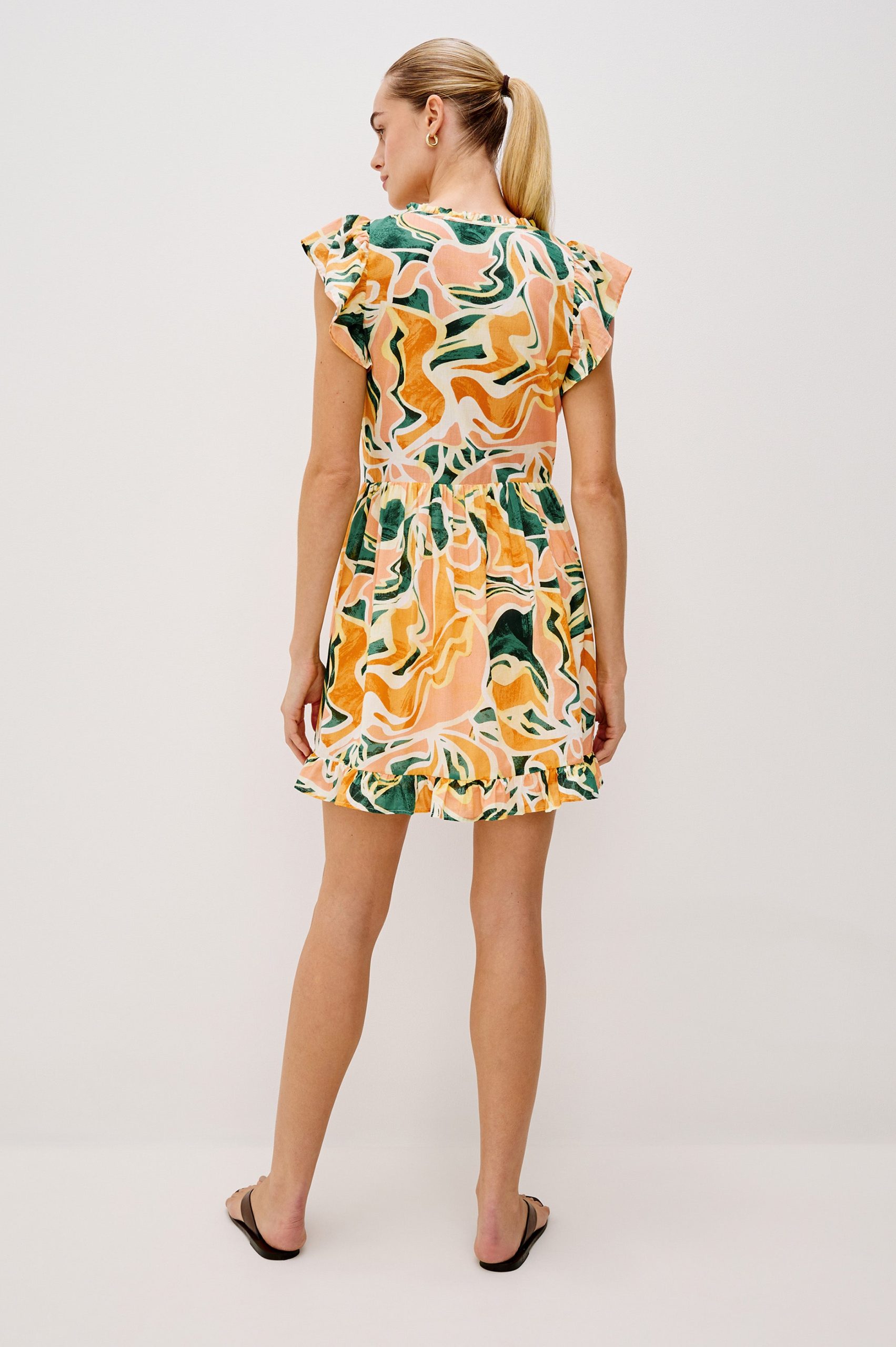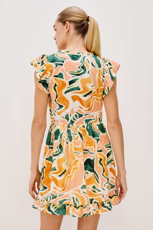 Zinnia is a kaftan-inspired mini dress, crafted from beach cotton with flutter sleeves and a ruffle hem. This style features a babydoll silhouette and a plunge neckline.