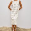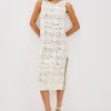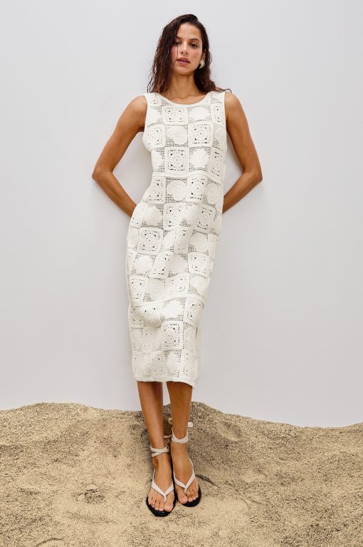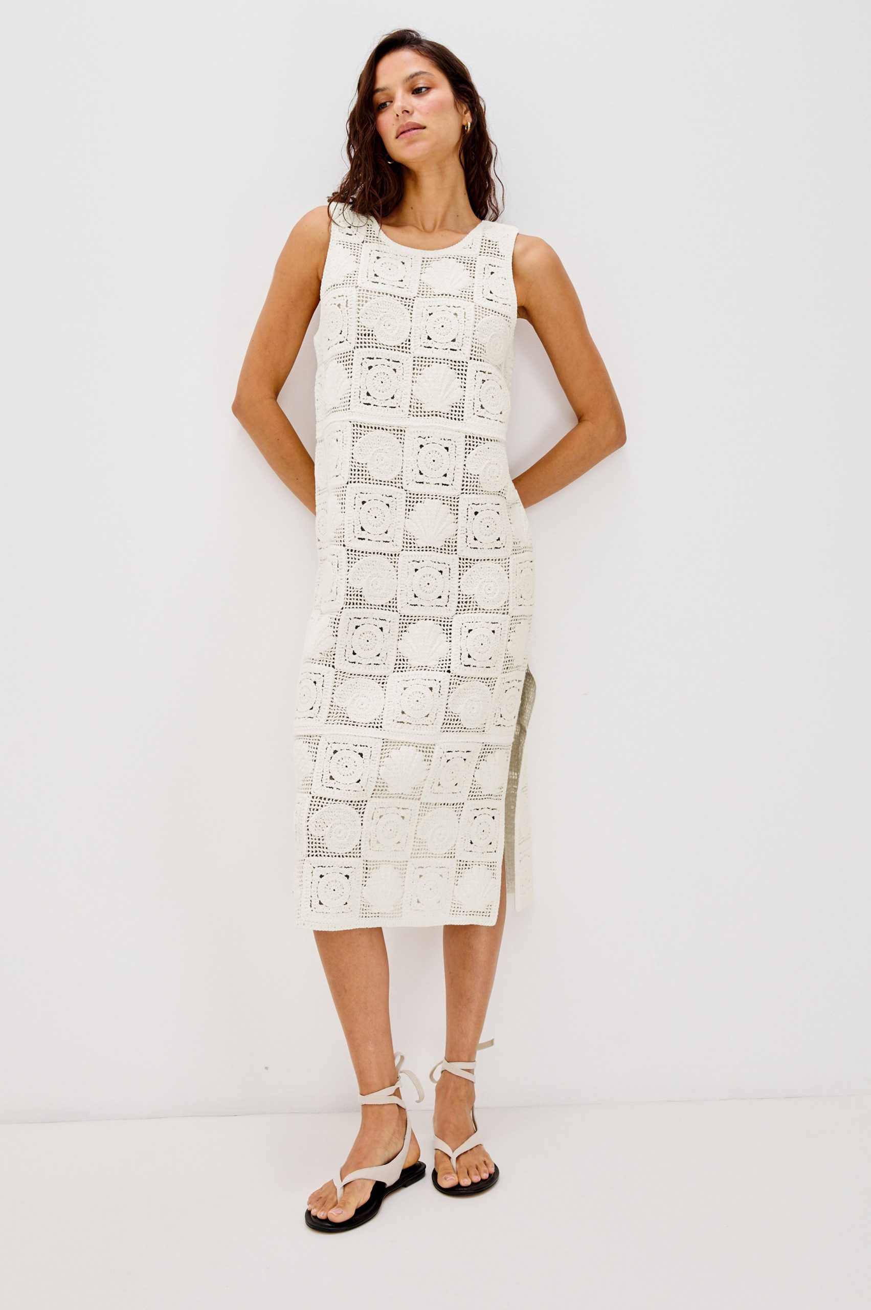 The Calla is a sleek, sleeveless dress crafted from comfortable wide-rib knit cotton. Its classic silhouette is updated with a side slit and open-stitch shell motif crochet design.